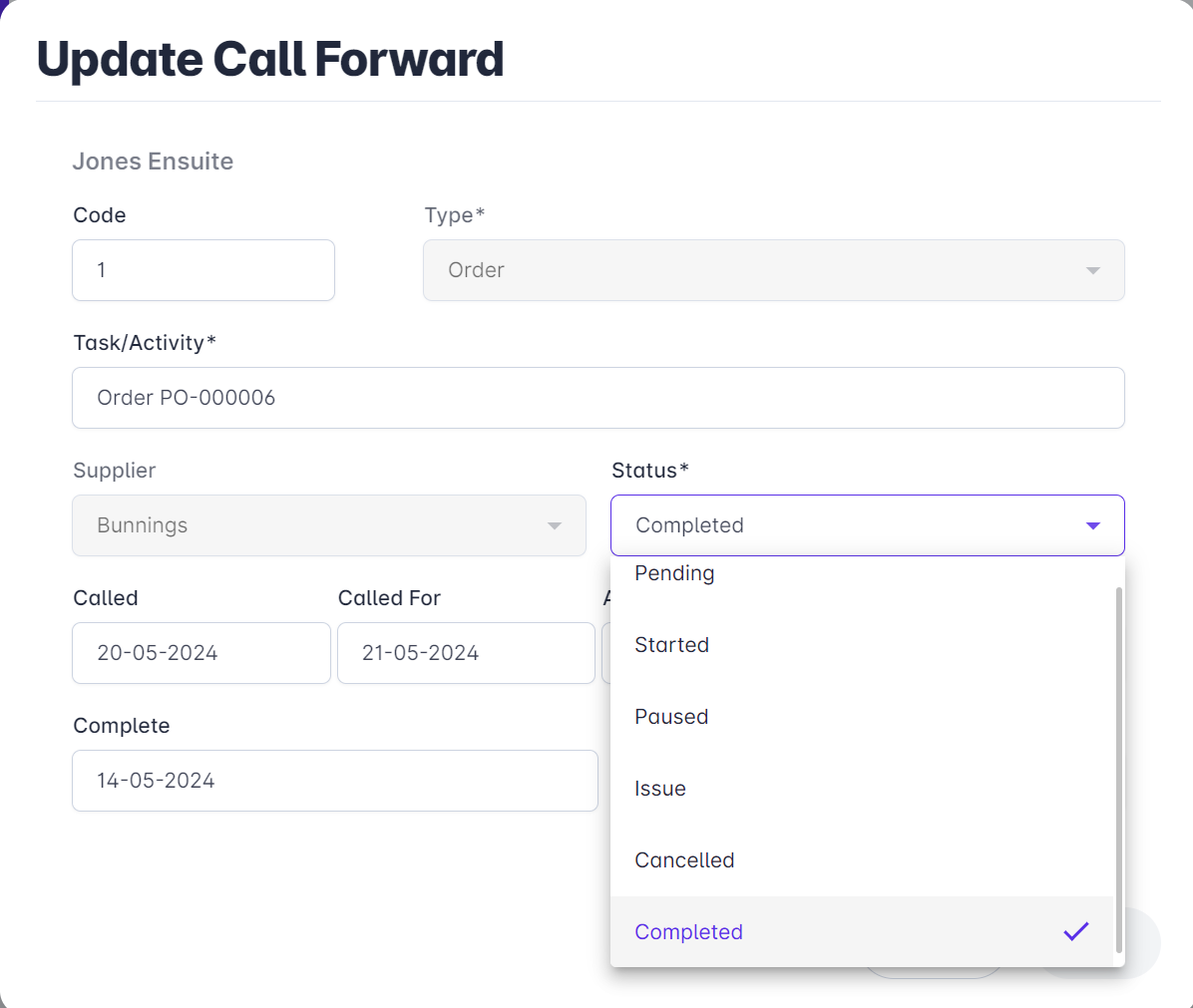 Complete - Enter the Complete date in the Update Call Forward screen. The status on the Call Forward screen automatically changes to Complete.