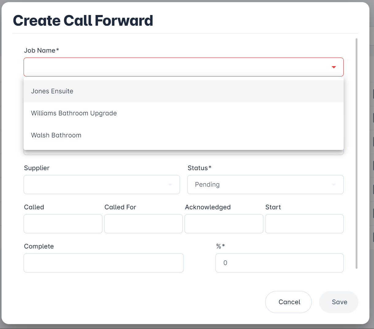 The Call Forward is an optional feature of Eazimate. It is commonly used in the building trade for the management of a Job(s). The main benefits include the ordering, coordination, and delivery of Supplier orders and sub-contractors, as well as the management of activities.