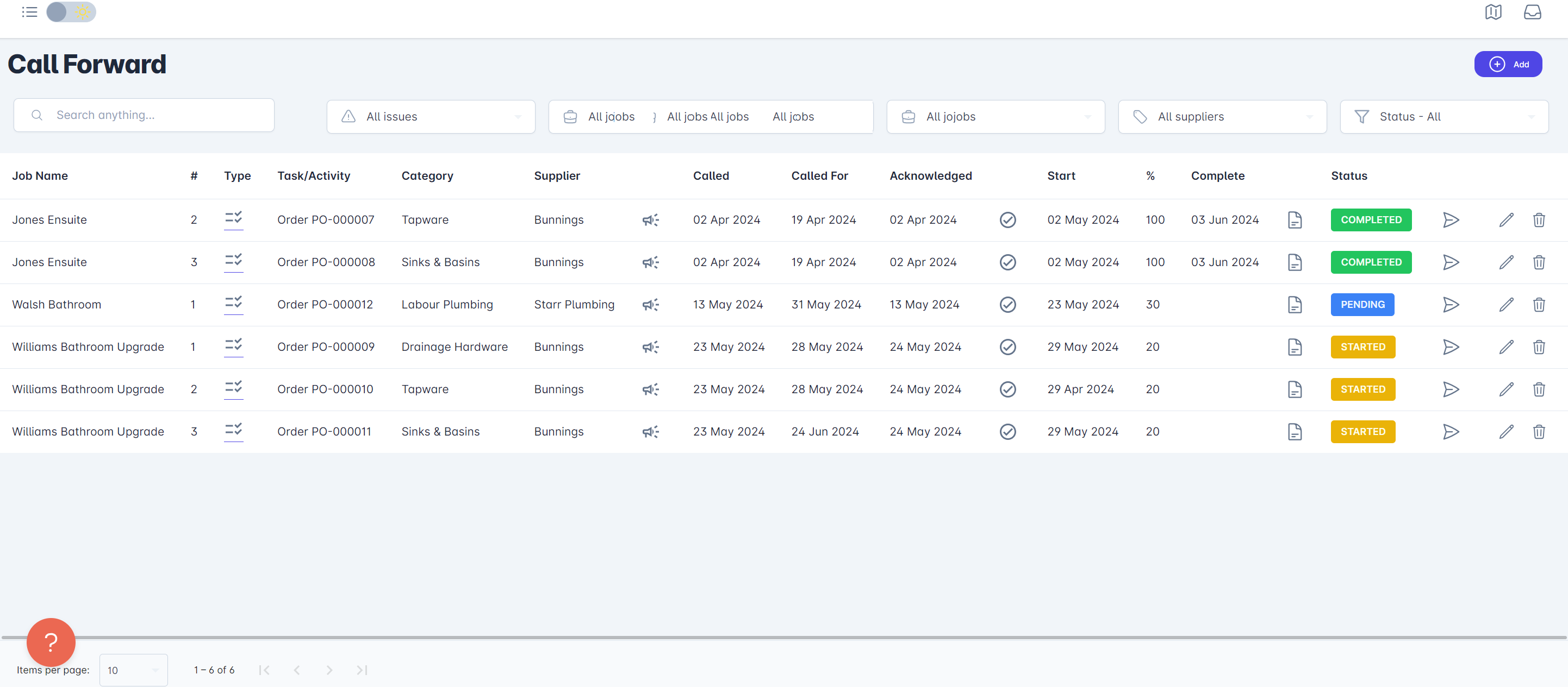 The Filters across the top of the page (Search anything, All issues, All jobs, All suppliers, Status all) enable you to narrow down your view if you have many Call Forward items.