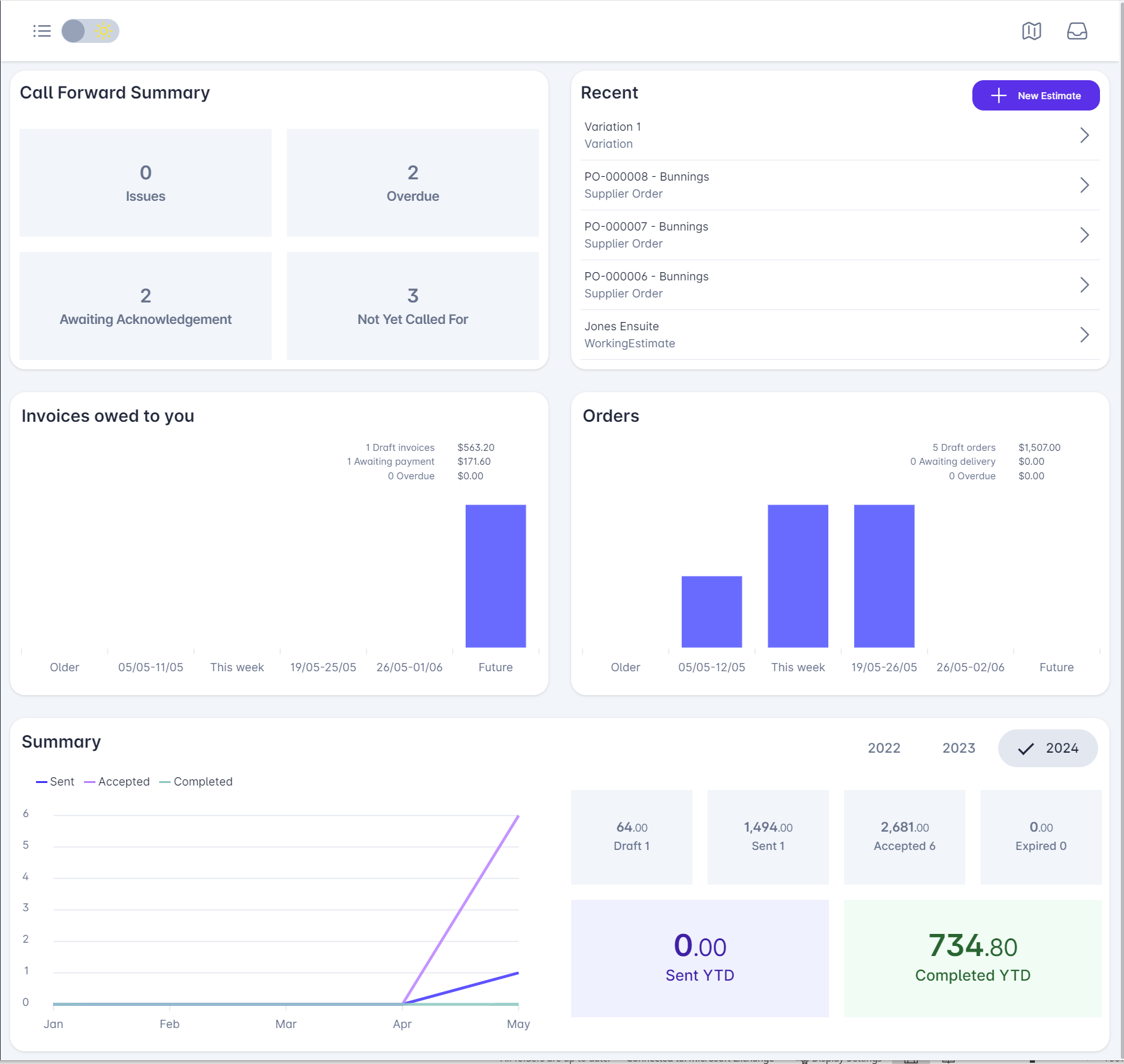 - A Summary of activity presented by month and year. Hover over the grid line to view the Estimates sent, accepted, and completed each month.