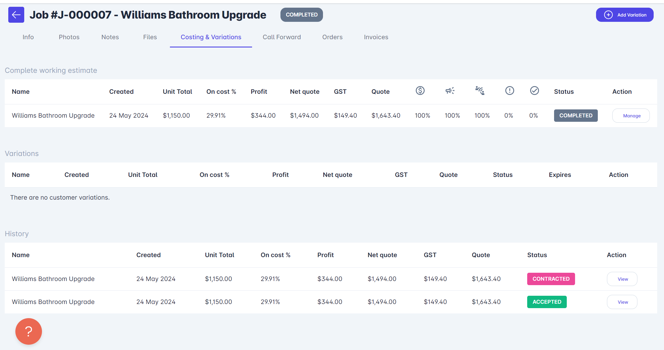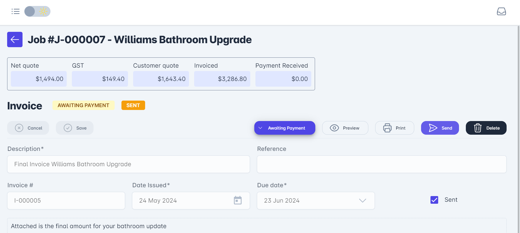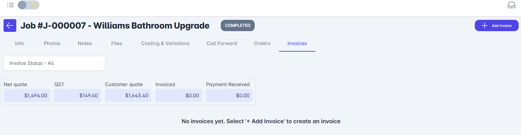 In the following example, the job 'Williams Bathroom Upgrade' has been completed by selecting the Completed status. If no Variations are required and you are ready to invoice, select Invoices from the menu at the top of the page.