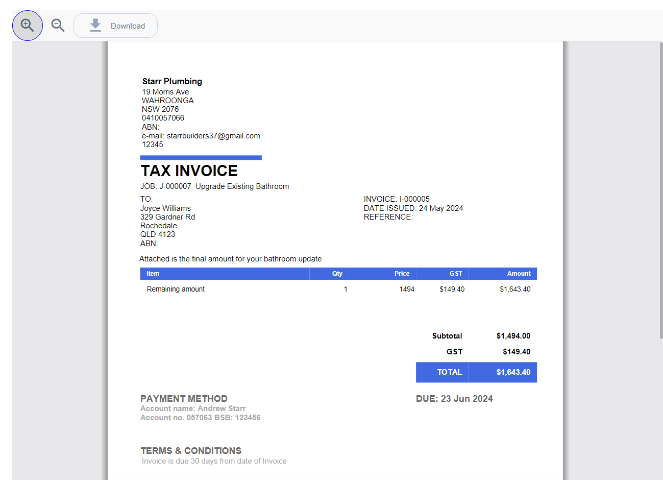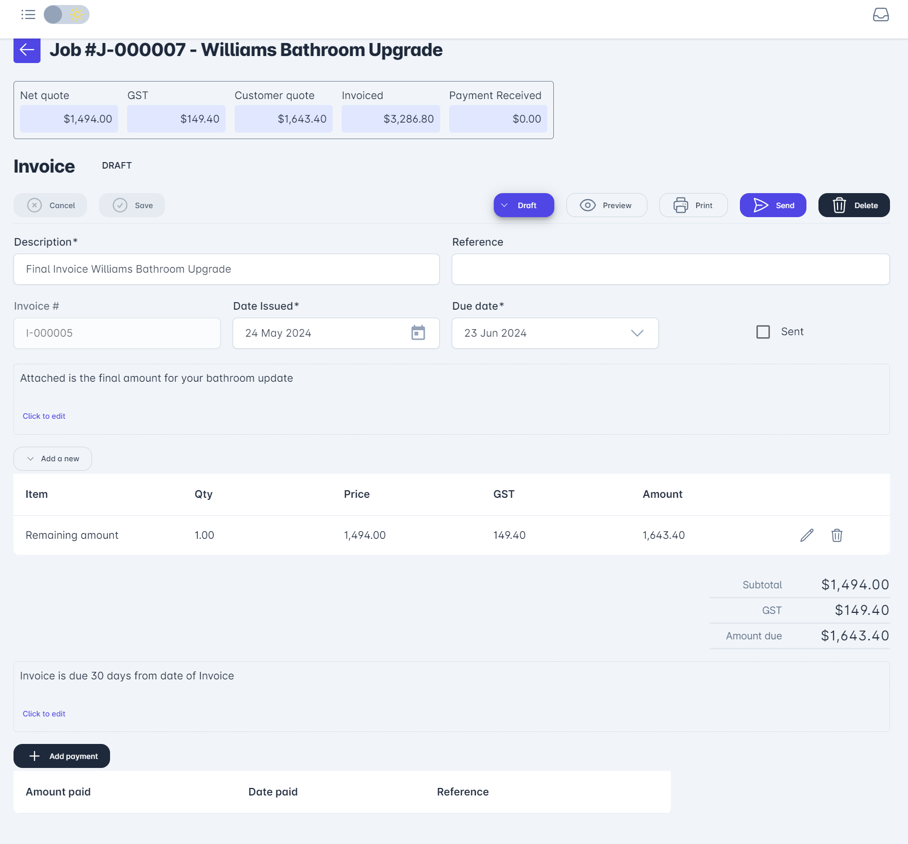 The following screen presents with the total amount for the job. Select + Add Invoice
