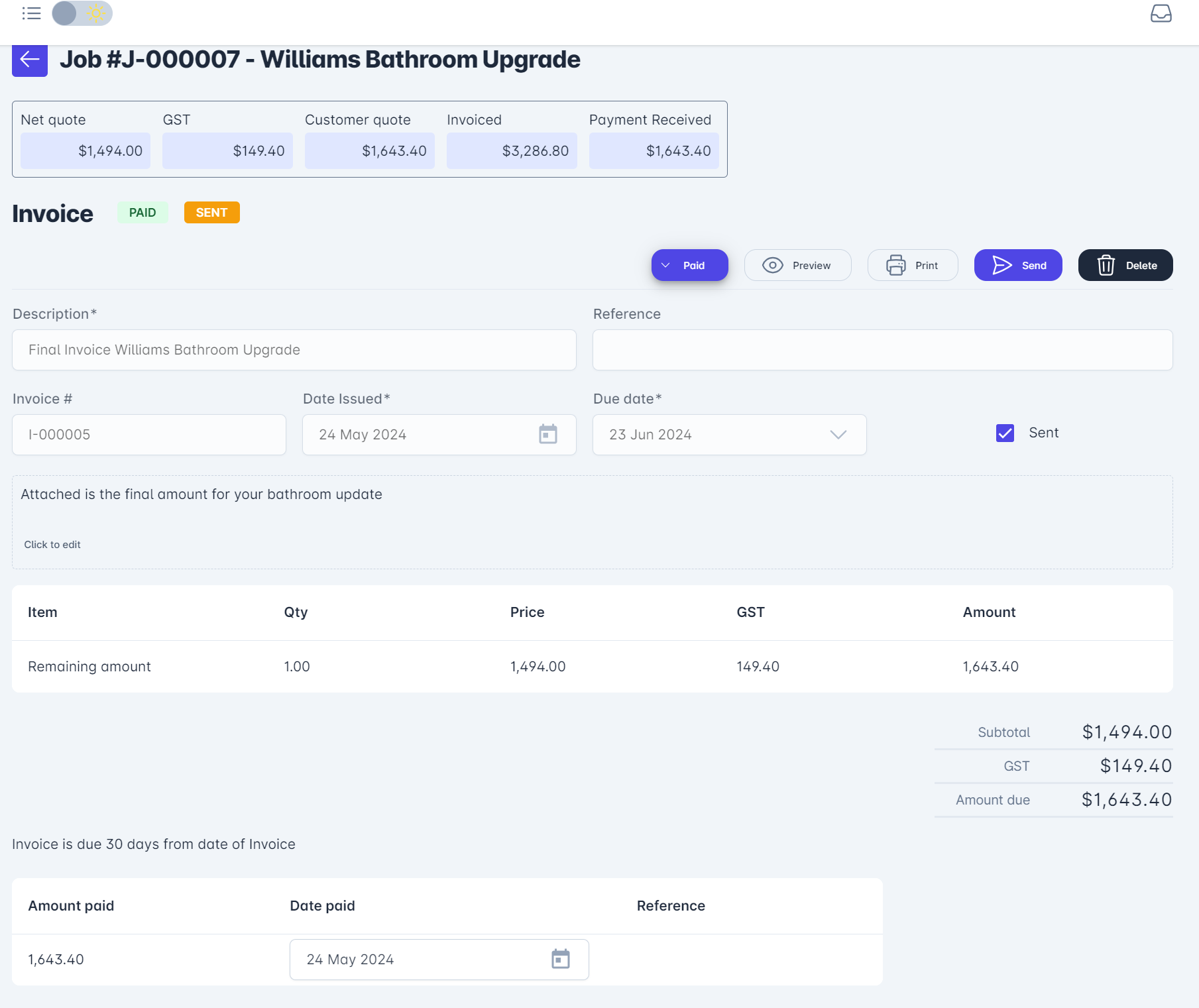 When a Payment has been made, you can update the status by selecting the invoice in the Jobs screen and changing it to Paid. This action will automatically update the Amount Paid field.