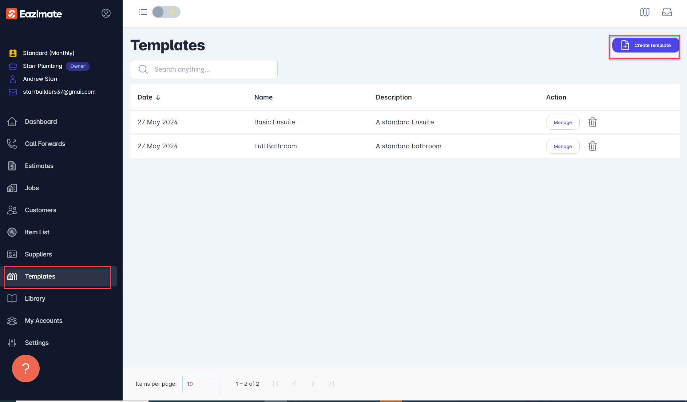 To create a new Template, access the Templates section from the main menu and select Create template located in the top right corner of the screen. Below is an example of 2 templates already setup.