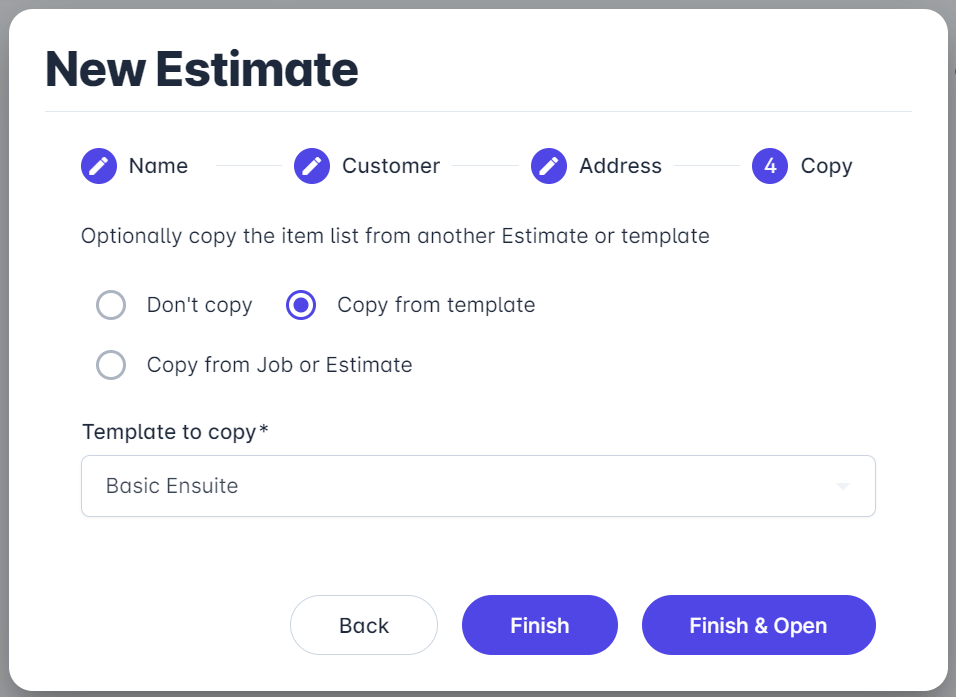 Instead of starting a new estimate from the bottom up (Don't copy option), you have the option to use a Template (if created) containing preferred categories and items for a specific type of work e.g. you may have a template for Ensuite Bathroom, Full Bathroom with Bath or Full Bathroom with Spa. The platform allows an unlimited amount of templates.